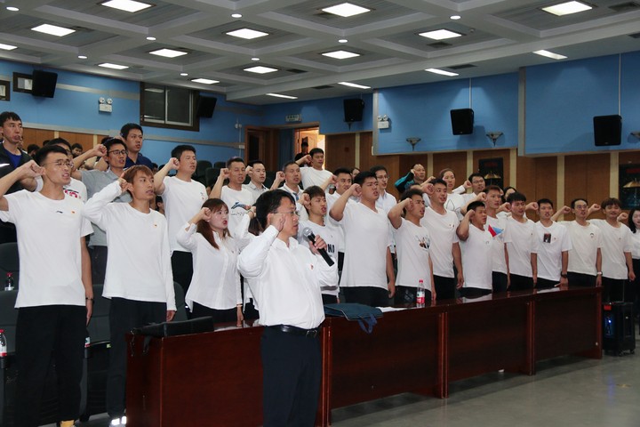 仪式开始前,公司党委书记为新入党的17名预备党员佩戴了党员徽章。下午2:50,公司新发展的17名预备党员、40余名师生老党员着装统一、佩戴党员徽章,在汤为明同志的领誓下,与全省全校各级党组织同步,面对党旗进行庄严宣誓。