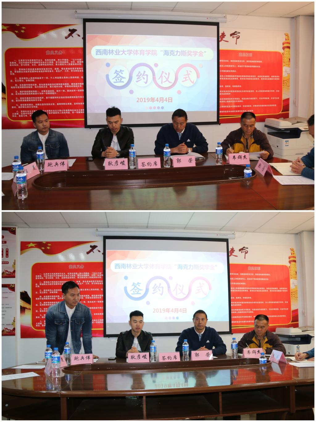 2019年4月4日上午11:40,ylg060net永利娱高与云南海克力斯健身服务有限公司在体育馆南门112会议室举行“海克力斯奖学金”签约仪式。云南海克力斯健身服务有限公司董事长耿彦峻、副总经理鲍兵伟、董事长助理邵帅、人事经理汪美以及ylg060net永利娱高郭荣书记、韦群杰经理、陈涛副书记、各科室负责人、行政坐班人员、各班班长、团支书参加本次签约仪式。