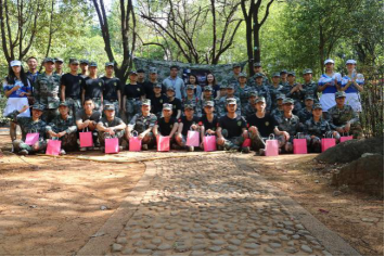 早些时候,在员工宿舍三栋前小树林里,两队持枪勇士正打得激烈酣畅,正是为与荧光夜跑而提前预热的真人CS活动。